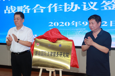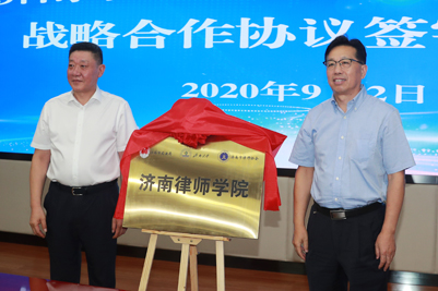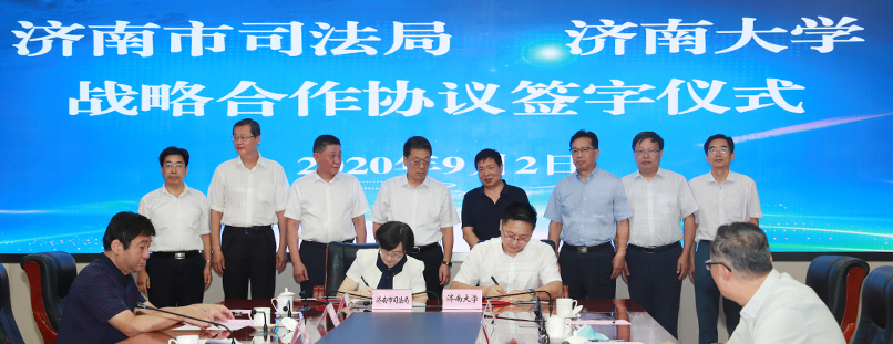 學校合作發展處處長盧旺,市司法局黨委委員、政治部主任石穎分別代表濟南大學和濟南市司法局簽署戰略合作協議。濟南市副市長吳德生,濟南大學黨委副書記王玉華共同為“濟南律師學院”揭牌。省司法廳黨委書記、廳長王玉君,濟南大學黨委書記徐景顏共同為“濟南國際法律服務研究院”揭牌。