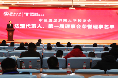 12月19日,濟南大學校友會成立大會暨一屆一次會員代表大會在濟南大學第一學術報告廳召開。山東省教育廳副廳長戴龍成、山東省民政廳社會組織管理局副局長姬升峰、濟南大學黨委書記徐景顏,黨委副書記王玉華、張碩秋,副校長王志、劉宗明、李光紅、楊景波、張勇,紀委書記續鐵,山東大學、山東師范大學、山東財經大學、山東交通學院、齊魯師范學院、山東廣播電視大學校友工作負責同志,學校部分職能部門和學院主要負責同志,會員代表,近百名各地校友代表出席會議。會議由黨委副書記王玉華主持。