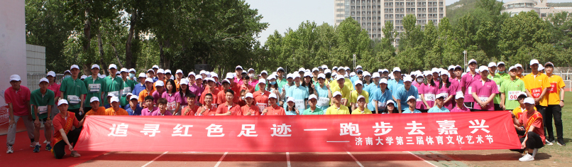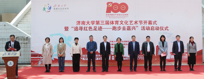 4月27日下午,由濟南大學體育運動委員會主辦,共青團濟南大學委員會、濟南大學體育學院承辦的第三屆體育文化藝術節開幕式暨“追尋紅色足跡——跑步去嘉興”活動啟動儀式在主校區田徑場舉行。濟南大學體育運動委員會成員、組委會成員、各學院黨委副書記、團委書記及學生代表400余人參加活動。儀式由體育學院院長亓圣華主持。